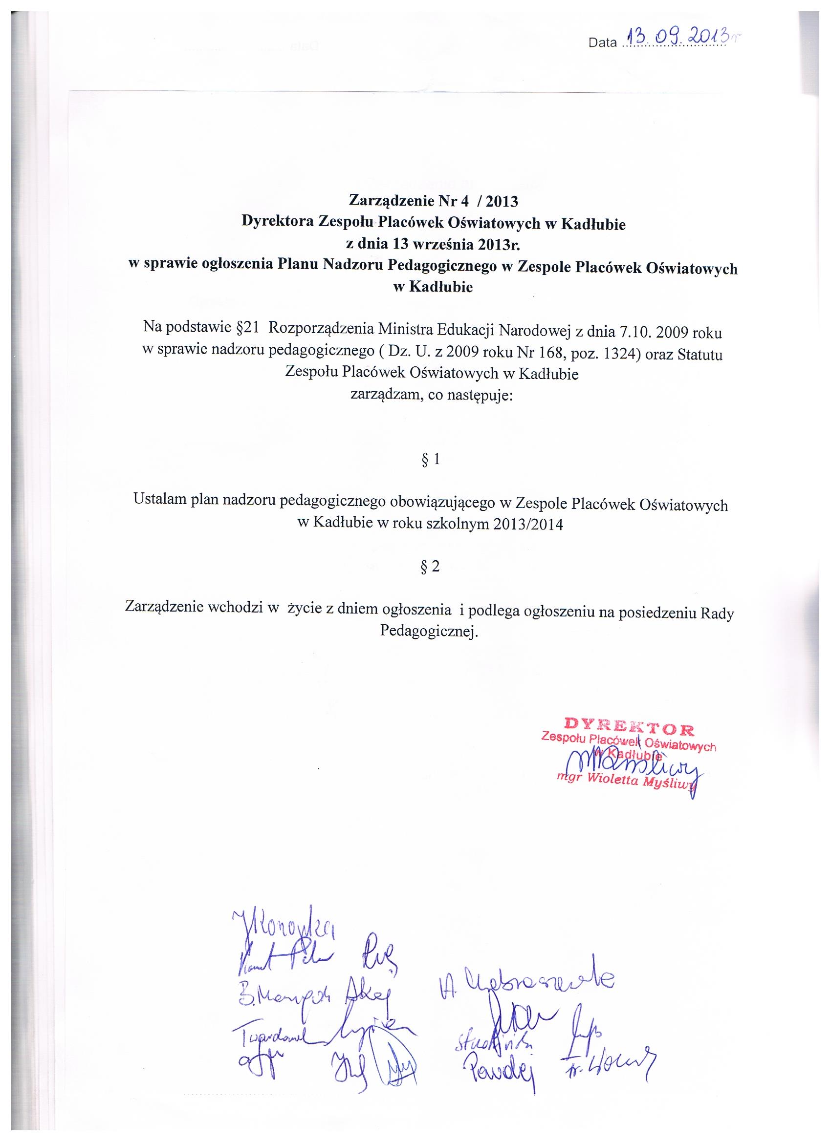 Zarządzenie Nr 4/2013 Dyrektora Zespołu Placówek Oświatowych w Kadłubie z dnia 13 wrzesień 2013 roku ogłoszenia Planu Nadzoru Pedagogicznego w Zespole Placówek Oświatowych w Kadłubie