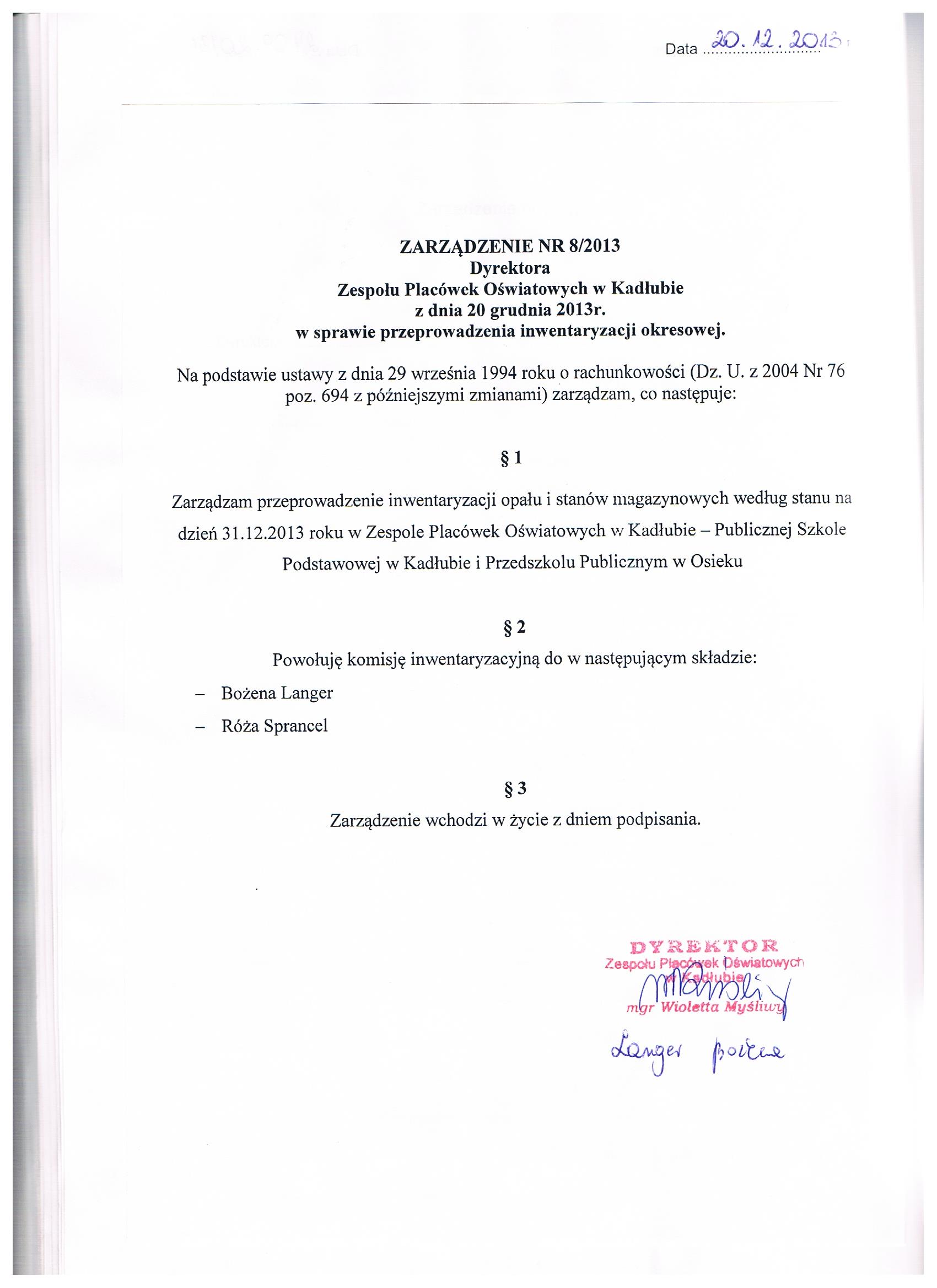 Zarządzenie Nr 8/2013 Dyrektora Zespołu Placówek Oświatowych w Kadłubie z dnia 20 grudzień 2013 roku przeprowadzenia inwentaryzacji okresowej