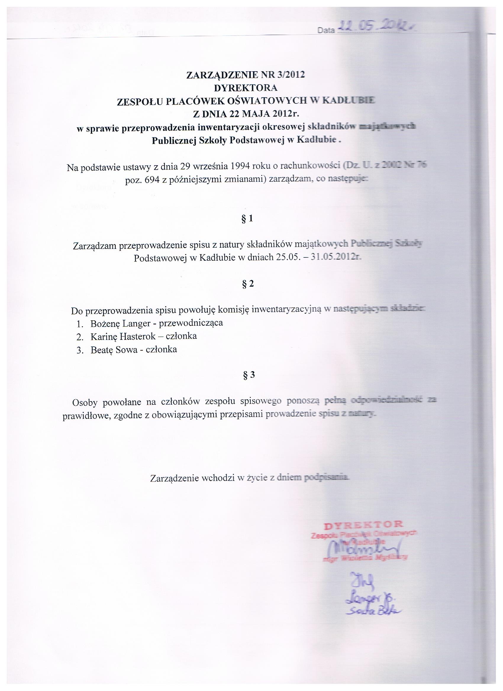 Zarządzenie Nr 3/2012 Dyrektora Zespołu Placówek Oświatowych w Kadłubie z dnia 22 maj 2012 roku przeprowadzenia inwentaryzacji okresowej składników majątkowych Publicznej Szkoły Podstawowej w Kadłubie